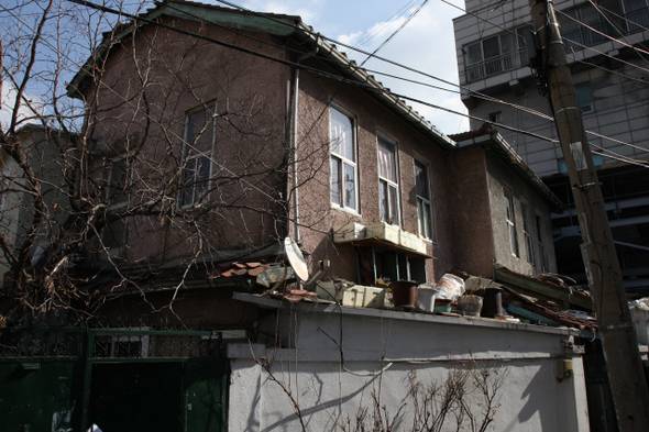 ■ 용산 곳곳에 남아 있는 적산가옥 "맞배지붕과 기와의 모양을 보니 전형적인 일본식 가옥이네요." 지난 19일 서울 용산구 청파3동 선린중학교 근처 골목에서 황평우 문화연대 문화유산위원장이 말했다. 황 위원장이 가리킨 2층 주택은 처마가 1층에 닿을 정도로 길었고 지붕의 각도도 무척 예리해 이국적인 분위기를 풍겼다. 황 위원장은 "일본은 비와 눈이 많이 오기 때문에 이를 빨리 흘려보내기 위해 지붕을 가파르게 만든다"고 설명했다.