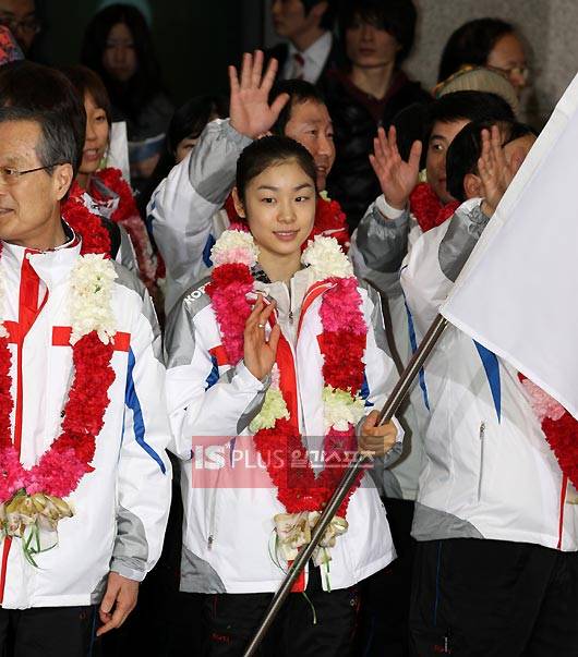 밴쿠버동계올림픽선수단이 인천공항을 통해 귀국했다. 환영식 행사서 태극기를 든 김연아가 손을 흔들고있다정시종기자 [capa@joongang.co.kr]