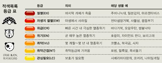 위기보다 높은 단계인 위급은 해당 생물이 야생에서 빠른 시간 안에 극심한 멸종위기를 맞고, 위기보다 낮은 취약은 몇 개월∼몇 년 안에 높은 멸종위기에 놓일 거라는 뜻이다. 판다는 위기, 코뿔소와 북극곰은 취약 등급으로 분류된다.