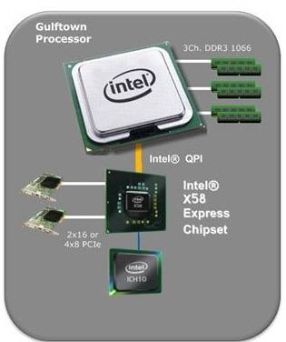 걸프타운 프로세서-32나노미터, 2세대 Hi-K 프로세서 핵심 기능6코어 / 12스레드코어 i7 900 시리즈와 호환하이퍼스레딩 기술터보부스트 기술내장 메모리 컨트롤러DDR3 1066 지원인텔 퀵패스 인터커넥트X58 익스익스프레 x16 2개(또는 x8 4개)