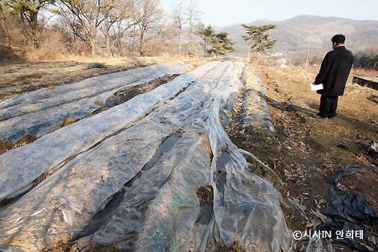 경기도 의정부시 고산동 강북구청장 부인 소유의 땅. 농사용 비닐이 아직 그대로 방치되어 있다. |