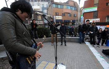 김예슬씨를 응원하기 위해 16일 열린 문화제에서 록 공연이 펼쳐지고 있다. 김창길 기자김예슬 선언 이전의 20대는, 김예슬씨가 대자보에 쓴 대로 '빛나는 G세대'이거나 '빚내는 88만원세대'였다. 물론 전자에 속하는 건 선택받은 극소수이며 대부분은 후자에 속한다는 걸 20대도, 기성세대도 알고 있었다. 다만 그 현실이 남루하기에 모두들 모른 척했을 뿐이다. 그러나 김예슬씨의 자발적 퇴교 선언으로 현실은 적나라한 모습을 드러냈다. 이제는 누구도 외면할 수 없게 되었다. 김예슬씨의 말처럼 "작지만 균열은 시작된" 것이다.