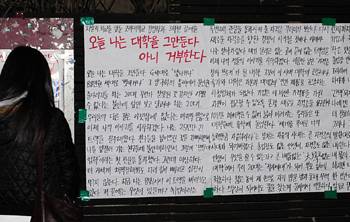 지난 10일 김예슬씨가 자발적 퇴교를 선언하며 고려대 정경대 후문에 붙인 대자보를 한 학생이 읽고 있다. 김정근 기자카페는 20대의 고통을 몰랐거나, 혹은 알면서도 외면했던 기성세대들의 자성의 장이 되기도 한다. 지천명의 나이라는 최흥집씨는 "나에게 날카로운 돌덩이 하나가 날아왔다. 내 자식들보다도 작은 아이가 사회를 향해 일성포효를 하고 있다. 미안하다. 정말로 미안하다. 용서를 빈다"는 글을 올렸다. 내년에 대학 갈 딸을 뒀다는 '열공줌마'는 "sky에 어떻게든 밀어넣어보고 싶어 아이를 다그치는데 정작 무엇을 위한 건지요. 내몰리는 내 아이가 안쓰럽고 대학에서 버거운 젊음이 가슴 아프네요"라고 했다.