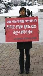 < 사진 '레프트21' 제공 > 지난 10일 고려대 경영학과 3학년 김예슬씨가 대자보를 통해 대학을 '거부'한다고 선언했다. 자발적 퇴교 선언, 아니 '인간 선언'이었다. 경향신문(3월11일자 1면) 보도로 이 사실이 알려졌고, 인터넷 공간이 들끓었다. 보수신문들은 짐짓 외면했지만 그렇다고 김씨의 '작은 혁명'을 가릴 수는 없었다. 20대들이 대학과 자본의 탑에 균열을 내는 '돌멩이'가 되겠다며 앞다퉈 나서기 시작했다. 인터넷포털 다음에 생긴 카페 '김예슬 선언'(cafe.daum.net/kimyeseuls)은 이들이 구축한 대표적 진지(陣地)다. 지난 15일 개설된 이 카페는 갓 1주일을 넘겼지만 벌써 회원 수가 600명을 넘어섰다. 카페지기 '꿈꾸는린'은 "이제 우리가 김예슬이 될 차례다. 우리 이대로 돌아서지 말자. 작은 돌멩이인 우리들이 함께 바위가 되자"고 밝히고 있다.
