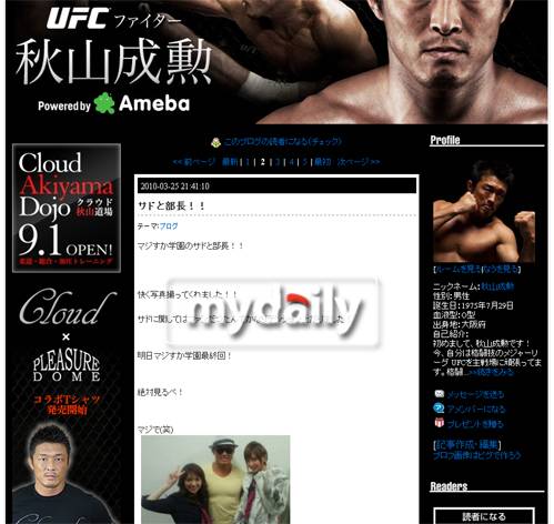 추성훈은 또 AKB48의 맴버인 오오시마 유코, 시노다 마리코와 함께 찍은 사진도 공개했다. 이 사진은 시노다 마리코의 홈페이지에 먼저 올려져 언론에 공개됐었다. 먼저 그에 대한 감사의 말을 남긴 추성훈은 "내일 방송 될 '마지스카 학원(マジすか学院)'을 꼭 본방 사수하겠다"고 다짐했다.