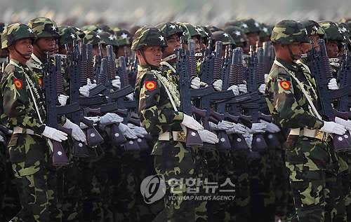 epa02094584 Myanmar troops march in formation during the 65th anniversary Armed Forces Day in the new capital city Naypyitaw, Myanmar, 27 March 2010. The Myanmar's junta chief implied that the military will play a pivotal political role in the country after this year's planned election, which most observers fear will be neither free nor fair. Myanmar is ruled under military regime since 1962, the junta promised to hold the elections this year which is the first in two decades. EPA/RUNGROJ YONGRIT < 뉴스의 새 시대, 연합뉴스 Live >< 모바일 애플리케이션 >< 포토 매거진 >< 저작권자(c)연합뉴스. 무단전재-재배포금지. >
