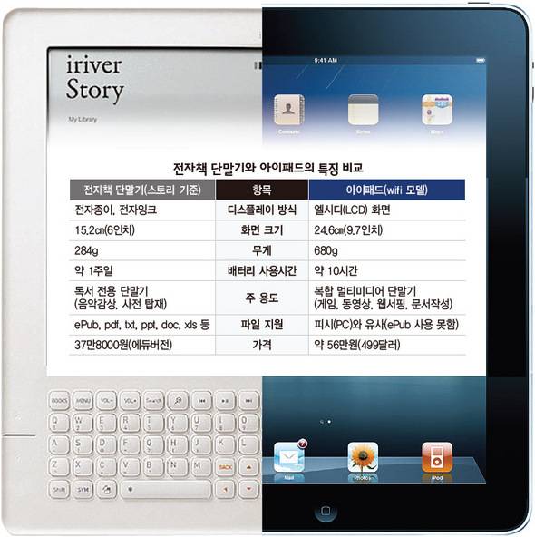 기존 전자책 단말기는 대부분 전자잉크 기술을 써왔다. 미세한 전자잉크 알갱이들을 흩었다가 모아 글자와 이미지를 표시하는 방식이다. 화면 뒤 조명(백라이트)이 필요없어 전력 소모가 극히 적고, 한번 충전해 9000여쪽을 읽을 수 있다. 하지만 컬러를 표시할 수 없고 동영상도 볼 수 없다. 반면에, 아이패드는 터치로 조작하는 '손안의 피시'다. 동영상 등 피시에서 하던 모든 것을 모두 구현한다. 전자책을 책처럼 넘기며 볼 수 있고, 신문의 사진을 클릭하면 동영상이 돌아간다. 백라이트를 쓰고 배터리 사용시간이 짧다.