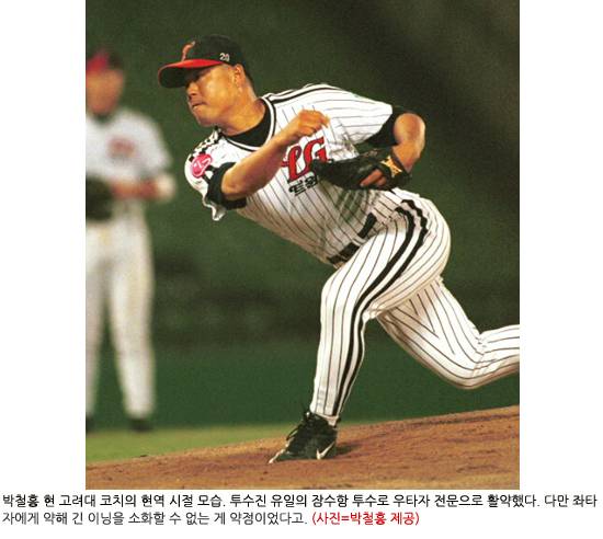 18경기 3승 1패 1세이브 방어율 3.69LG 투수진 유일의 잠수함. 빠른 볼과 서클 체인지업과 슬라이더를 구사했다. 민원기와는 반대로 좌타자, 특히 양준혁에게 매우 약했다고. "양준혁이 나만 등판하면 씨익 웃더라"고 회상할 정도다. 그 이유를 박철홍은 "커브가 없었고, 구종이 단순했기 때문"이라고 설명한다. "슬라이더도 휘는 게 아니라 직구 궤적처럼 들어가다 보니, 좌타자가 치기 쉬웠다. 우타자는 치면 땅볼이 되는데 좌타자에게는 안 통하더라." 박철홍의 말이다.
