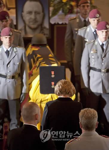 epa02109797 German Chancellor Angela Merkel (C) bows to the coffin of one of the killed Bundeswehr soldiers during the obsequies in St Lamberti church in Selsingen, Germany, 09 April 2010. Three paratroopers were killed in action during a combat in Afghanistan's Kunduz region on 02 April 2010, another eight soldiers were injured. EPA/JOERG SARBACH / POOL < 뉴스의 새 시대, 연합뉴스 Live >< 모바일 애플리케이션 >< 포토 매거진 >< 저작권자(c)연합뉴스. 무단전재-재배포금지. >