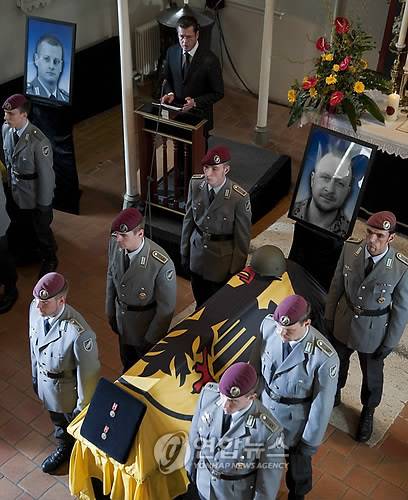 epa02109924 A German Bundespresseamt (BPA) handout photo showing German Minister of Defense Karl-Theordor zu Guttenberg (back) speak during the obsequies for the killed Bundeswehr sodiers in St Lamberti church in Selsingen, Germany, 09 April 2010. Three paratroopers were killed in action during a combat in Afghanistan's Kunduz region on 02 April 2010, another eight soldiers were injured. EPA/STEFFEN KUGELER / BPA HANDOUT EDITORIAL USE ONLY/NO SALES < 뉴스의 새 시대, 연합뉴스 Live >< 모바일 애플리케이션 >< 포토 매거진 >< 저작권자(c)연합뉴스. 무단전재-재배포금지. >