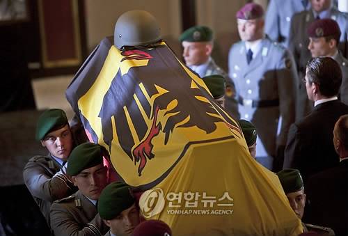 epa02109988 Bundeswehr soldiers carry the coffin of one of the killed comrades and pass German Minister of Defense Karl-Theodor zu Guttenberg (R) during the obsequies in St Lamberti church in Selsingen, Germany, 09 April 2010. Three paratroopers were killed in action during a combat in Afghanistan's Kunduz region on 02 April 2010, another eight soldiers were injured. EPA/JOERG SARBACH / POOL < 뉴스의 새 시대, 연합뉴스 Live >< 모바일 애플리케이션 >< 포토 매거진 >< 저작권자(c)연합뉴스. 무단전재-재배포금지. >