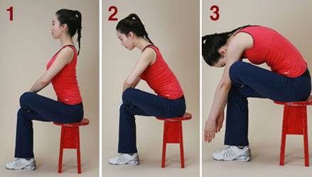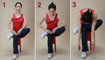 우선 바른 자세로 의자에 앉은 뒤 한쪽 다리를 반대쪽 다리의 무릎에 가볍게 올려놓는다. 올린 다리의 발목 부분을 두 손으로 지그시 감싼 다음 상체를 그대로 기울여 준다.