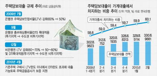 금융당국은 금융위기 이후 저금리와 유동성 지원으로 부동산 가격이 들썩거리자 금리인상 대신 부동산 관련 금융규제 카드를 꺼내 들었다. 지난해 7월에는 은행권 주택담보인정비율(LTV)을 60%에서 50%로 낮췄고, 9월에는 은행권 DTI를 수도권 비투기지역까지 확대했다. 그래도 부동산 가격이 잡히지 않자 10월에는 저축은행 등 비은행권에 대해서도 LTV를 강화하고 DTI 규제를 수도권 전역으로 확대했다. 금융당국의 규제강화로 주택담보대출 증가세가 크게 둔화됐다.