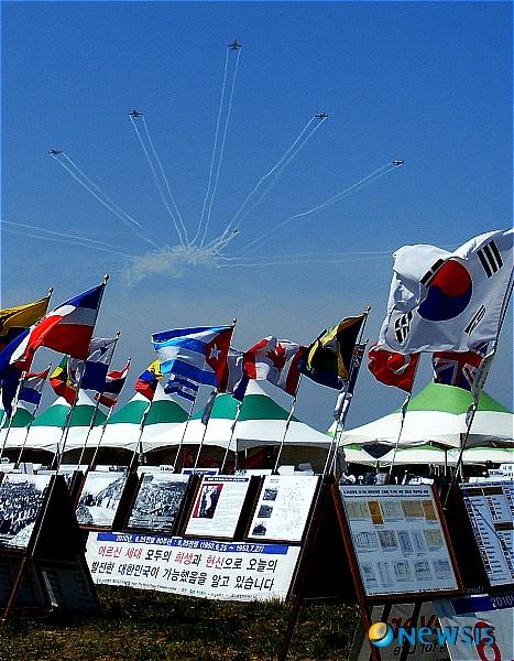 【안산=뉴시스】전진환 기자 = 1일 경기 안산시 사동에서 열린 2010년 경기국제항공전에 참가한 6.25전쟁 사진전을 배경으로 대한민국 공군 특수 비행팀인 블랙이글스가 고도의 비행기량을 선보이고 있다. (사진=사단법인 월드피스자유연합 제공)