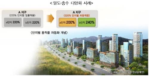 도심 및 역세권에는 단지외곽을 건물로 둘러싸는 중층 블록형에 고층 타워형을 혼합한 블록형 단지를 조성한다. 건물 외관을 다양하게 디자인할 수 있도록 일정범위 내에서 발코니가 돌출된 부분에 대해서는 동간거리 산정에서 제외하는 등 관련 규정을 완화할 계획이다.