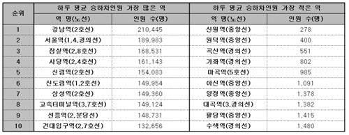 일일평균 승하차인원이 가장 많은 상위 10개 역은 모두 지하철 1~4호선에 속한 역들로, 이들 중 2호선은 무려 8개(환승역 포함)에 달했다. 반면 일일평균 승하차인원이 가장 적은 10개역은 주로 중앙선과 경의선에 위치한 역들이었으며, 대부분 수도권 외곽지역에 위치해 이용객 수가 상대적으로 적었던 것으로 나타났다.