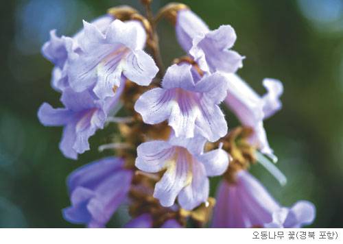 꽃을 보면 두 나무는 다르다는 사실을 알 수 있다. 오동나무는 5월 들어서면서부터 옅은 보라색의 꽃을 피운다. 꽃 한 송이의 길이가 6㎝ 정도의 나팔 모양이다. 하나의 잎으로 이루어진 통꽃이 나뭇가지 끝에 모여서 피어나는데, 꽃송이마다 안쪽에 푸른 빛의 줄이 선명하게 들어 있어 전체적으로 매우 화려하다.