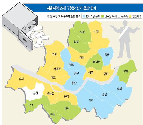 서울 25개 구청장 선거는 여야 모두 과반 승리를 장담할 수 없는 혼전 양상으로 전개되고 있다. 2006년 지방선거에서는 한나라당이 25개 구청장을 싹쓸이했으나, 17일 현재 초반 판세는 절반 가까운 10여곳 이상에서 오차 범위 내 접전이 펼쳐지고 있다. 한나라당은 강남 3구(서초·강남·송파) 등 전통적 우세 지역에서, 민주당은 동대문·강북·도봉으로 이어지는 '강북벨트'에서 강세를 보이고 있다. 하지만 여야 모두 이들 지역에서 확실한 우세를 장담할 수 없는 상황이다. 여기에다 현역 구청장들이 대거 무소속으로 출마해 선전하고 있는 것도 변수로 작용할 전망이다.