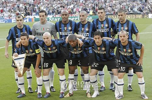 epa02169281 Inter Milan players (top row, L-R) Goran Pandev, goalkeeper Julio Cesar, Maicon, Cristian Chivu, Lucio, Walter Samuel; (front row, L-R) captain Javier Zanetti, Esteban Cambiasso, Samuel Eto'o, Diego Milito and Wesley Sneijder pose for photographers before the UEFA Champions League final between Bayern Munich and Inter Milan at the Santiago Bernabeu stadium in Madrid, Spain, 22 May 2010. Inter won 2-0. EPA/EMILIO NARANJO NO MOBILE DEVICES < 뉴스의 새 시대, 연합뉴스 Live >< 모바일 애플리케이션 >< 포토 매거진 >< 저작권자(c)연합뉴스. 무단전재-재배포금지. >