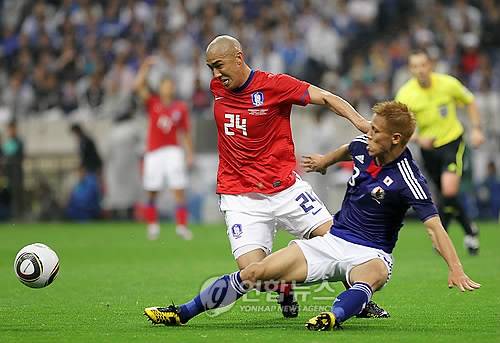 (사이타마 < 일본 > =연합뉴스) 이지은 기자 = 24일 일본 사이타마 스타디움에서 열린 한-일 축구대표팀 평가전에서 차두리가 마쓰이 다이스케와 볼 다툼을 벌이고 있다. 2010.5.24