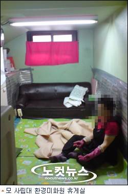 원래는 출입문도 없었지만 그나마 지난 3월에야 출입문을 달았다고 한다.양씨는 "바닥에 스티로폼을 깔고 이불과 주워온 소파를 놓으니 그럴 듯해졌다"며 "하루 20분 정도 쉬는 곳인데 없는 것보다는 낫다"고 말했다.