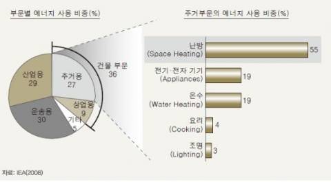 이를 위해서는 태양광, 풍력, 연료전지와 같은 신재생에너지 기술을 어떻게 건물에 적용할 수 있을지를 고민하게 될 것이며, 주택 에너지 소비량의 가장 큰 비중(55%)을 차지하는 냉난방에너지를 절감하기 위해 건물 배치, 고효율 단열재 및 고기밀의 창호 활용, 지붕 녹화 등을 고려하게 될 것이다. 또한 냉난방 에너지 다음으로 큰 비중(19%)을 차지하는 전기·전자기기의 에너지 소비량을 줄이기 위해 고효율 전자제품에 대한 소비자의 선호도도 높아질 수 밖에 없다. 그리고 새로운 제품으로 신재생에너지, 고효율 전자제품을 통합하고 외부 전력망과 효율적으로 연계하기 위한 HEMS(Home Energy Management System)나 BEMS(Building Energ y Management System), 스마트 미터(Smart Mater)에 대한 수요도 크게 늘어날 것이다.