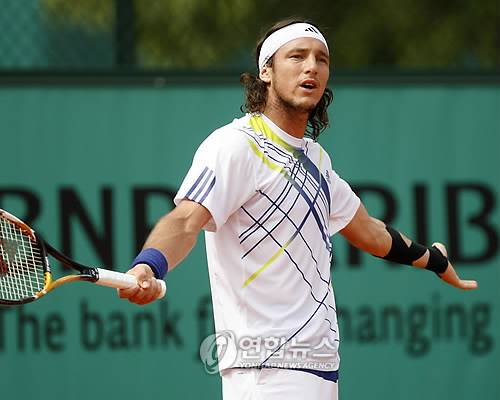 epa02172030 Juan Monaco of Argentina argues a call as he takes on Grega Zemlja of Slovenia during their first round match for the French Open tennis tournament at Roland Garros in Paris, France, 25 May 2010. EPA/GUILLAUME HORCAJUELO < 뉴스의 새 시대, 연합뉴스 Live >< 모바일 애플리케이션 >< 포토 매거진 >< 저작권자(c)연합뉴스. 무단전재-재배포금지. >