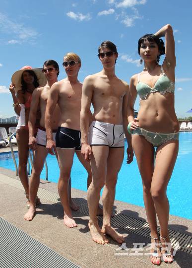 26일 서울 이태원 해밀톤호텔 야외수영장에서 속옷 차림의 남녀 모델들이 '피델리아 옴므 by 송지오'의 여름언더웨어 패션쇼를 진행, 눈길을 끌고 있다. '피델리아'는 CJ오쇼핑의 자체상표 란제리 브랜드로 올해는 디자이너 송지오와 손잡고 새상품을 선보였다.