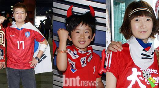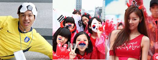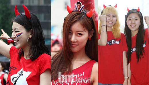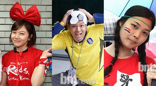 월드컵 응원의 필수 아이템은 뭐니 뭐니 해도 붉은 컬러를 이용한 스타일 코디. 이번 남아공 월드컵 첫 경기가 있었던 오늘, 길거리 응원장에는 온통 붉은 열기로 가득했다.