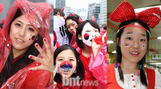 (가운데)친구들과 함께 거리응원에 동참한 상큼한 느낌의 미녀 악마들. 얼굴에 그려넣은 과감한 페이스 페인팅이 시선을 모았다. 코를 중심으로 얼굴 중앙을 가득 채워 그려넣은 태극문양과 하얀 바탕의 태극기가 남아공에 있는 태극전사를 향한 열정의 메시지를 읽을 수 있었다.