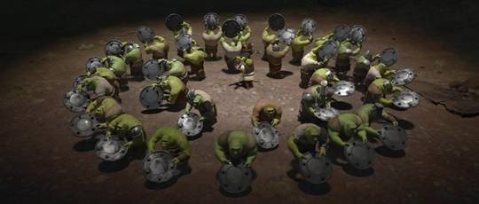 제작진은 댄서들에게 부채춤을 익히게 한 뒤 몸동작을 캡처, 3D에 옮기는 방식으로 이를 작품에 적용했다. 영화 상황에 맞게 부채는 방패로 대체됐다.