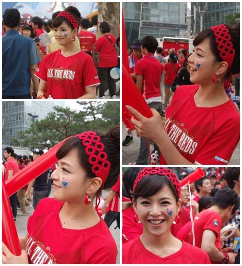 온통 붉은색으로 치장하고 코엑스 거리 응원에 나선 이신애는 막대풍선, 호루라기 등 다양한 응원 도구를 이용해 주위 사람들과 어울려 연신 '대한민국'을 외쳤다.