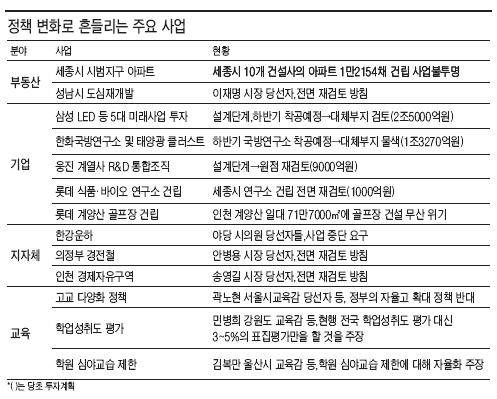 일관성을 잃은 정부 정책이 기업들의 발목을 잡기 시작했다. 각종 개발사업을 '전면 재검토하겠다'는 지방자치단체장 당선자들의 발언도 기업 의욕을 크게 위축시키는 양상이다.
