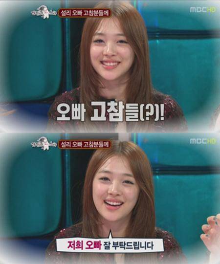 이에 MC들이 "오빠가 한창 힘들 시기다."면서 "군대에 있는 오빠의 고참들에게 영상 편지를 보내는게 어떠냐."는 제안에 설리는 "오빠 고참들, 안녕하세요."라면서 깜찍하게 인사를 건넸다.