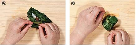1 소금을 약간 넣고 끓인 물에 근대 잎을 넣고 데친다.2 데친 근대 잎을 넓게 펴서 밥과 꽁치쌈장을 올리고 네 귀퉁이를 차례로 포갠다.3 ②의 쌈을 데친 미나리 줄기로 묶는다. ◎ 근대쌈밥