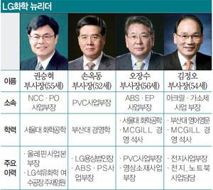 차세대 리더급으로는 손옥동 부사장(PVC사업부장), 오장수 부사장(ABS·EP사업부장), 김정오 부사장(아크릴·가소제사업부장) 등을 꼽을 수 있다. 손옥동 부사장은 LG화학의 부사장 9명 중 가장 젊은 58년생이다. 부산고를 졸업하고 부산대에서 경영학을 전공한 그는 '중국통'으로 통한다. 중국 시장점유율 1위인 LG용싱(Yongxing)법인장을 지내며 지난 2007년 매출 10억달러를 돌파한 뒤 2008년 부사장으로 승진했다. 특유의 화끈한 리더십을 갖고 있으며 중국사업에서 중요한 '관시'에 능하다는 내부평이다.