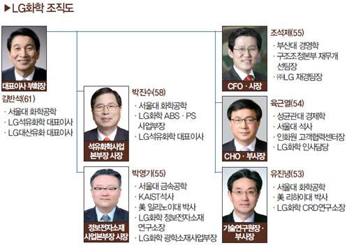 현재 LG화학은 김반석 부회장 아래 석유화학사업본부와 정보전자소재사업본부, 기술연구원이 있고 3명의 사장과 2명의 부사장이 이를 맡고 있는 구조다. 조석제 사장(CFO), 박진수 사장(석유화학사업본부장), 박영기 사장(정보전자소재사업본부장), 육근열 부사장(CHO), 유진녕 부사장(기술연구원장)이 그 주인공.