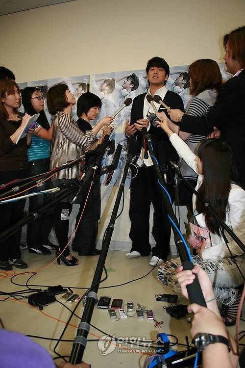 (도쿄=연합뉴스) 이태문 통신원 = 일본 매스컴들이 1일 도쿄의 요요기 제1체육관에서 열린 라이브 투어 'FUN FAN'의 마지막 공연에 앞서 故 박용하에 대한 비통한 심정을 밝히고 있는 한류스타 류시원을 취재하고 있다. 2010.7.2