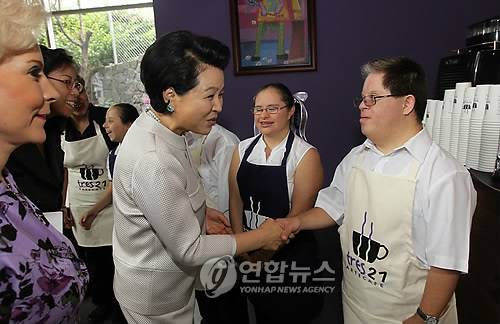 (멕시코시티=연합뉴스) 전수영 기자 = 이명박 대통령 부인 부인 김윤옥 여사가 1일 오전(현지시간) 멕시코시티 존 랭던 다운 재단을 방문해 학생들을 격려하고 있다. 2010.7.2
