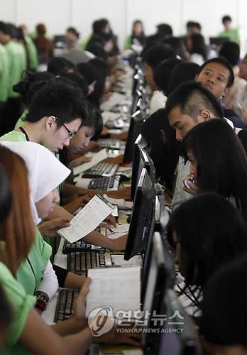 epa02233047 Indonesian jobseekers gather during a job fair in Jakarta, Indonesia, 02 July 2010. The Indonesian unemployment rate, which stood at 7.4 percent in February as reported by the Central Statistics Agency (BPS), is targeted to decline to 7 percent in 2011. EPA/MAST IRHAM < 뉴스의 새 시대, 연합뉴스 Live >< 모바일 애플리케이션 >< 포토 매거진 >< 저작권자(c)연합뉴스. 무단전재-재배포금지. >