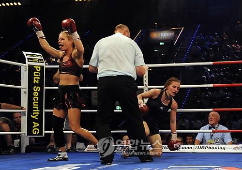 epa02235965 Canadian Jeannine Garside (L) raises her arms as opponent Germany's Ina Menzer (R) gets up from the canvas during their featherweight WBC, WBO and WIBF belt title fight at the Universum Champions Night in the Porsche Arena, Stuttgart, Germany on 03 July 2010. Garside won on a points decision at the end of the 10 round fight. EPA/MARIJAN MURAT < 뉴스의 새 시대, 연합뉴스 Live >< 모바일 애플리케이션 >< 포토 매거진 >< 저작권자(c)연합뉴스. 무단전재-재배포금지. >