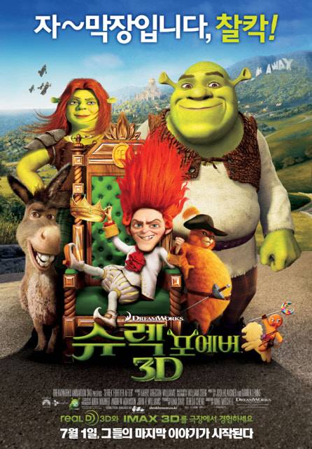 '슈렉 포에버'는 시리즈 완결작으로 뒤늦게 일상의 소중함을 깨닫고 이를 되찾기 위해 고군분투하는 녹색괴물 슈렉의 여정을 그렸다. 이수근이 한국어 더빙을 맡아 화제가 됐으며 3D로 제작됐다. 3D 애니메이션 최초로 200만 관객을 돌파한 '드래곤 길들이기'와 전작들의 흥행성적을 뛰어넘을지가 관심거리다.[관련기사]☞ '파괴된 사나이', '슈렉 포에버' 밟고 관객몰이☞ '슈렉 포에버', 개봉 첫주 1위… 전작 넘을까☞ 막장 '슈렉', 첫 주말 1위 예상..전작 넘을까☞ '슈렉'·'나잇 앤 데이'…할리우드 공습에 韓영화 휘청