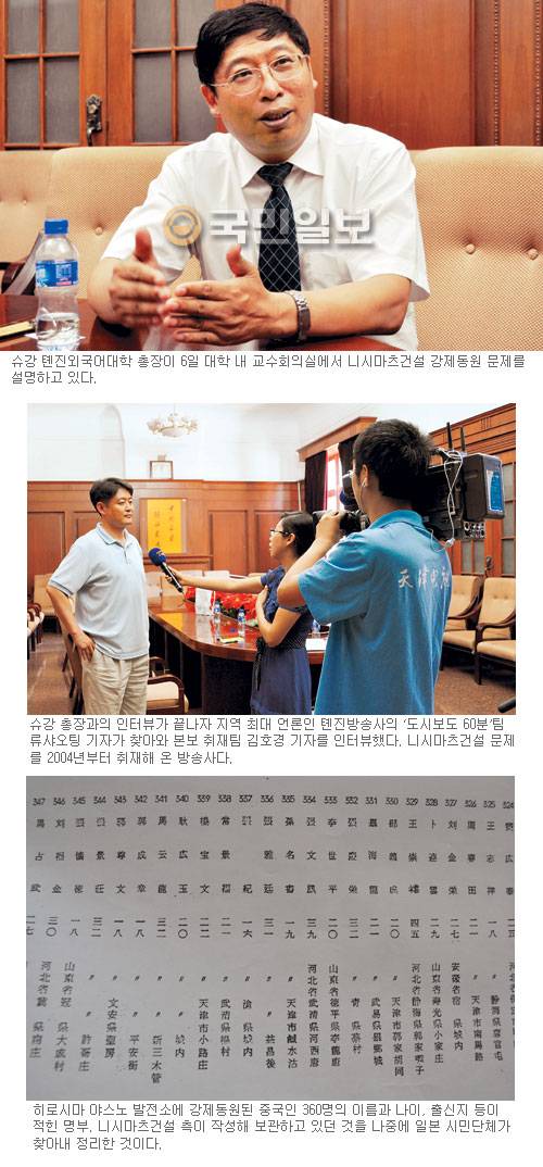 슈강(修剛) 톈진외국어대학 총장의 설명은 명쾌했다. 톈진(天津)시 허시(河西)구의 대학 내 교수회의실에서 지난 6일 만난 그는 중국 여론이 해당 기업을 움직여 '실리적 판단'을 하도록 유도했다는 요지로 말했다. 일본어 교수이기도 한 그는 니시마츠건설 소송 사건의 초기부터 관여하면서 피해자들을 적극 도왔기 때문에 전후 관계를 잘 알고 있었다. 그의 말처럼 이 사안에 대한 중국 정부의 입장은 확고하고 단호했다.