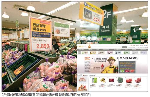 그럼 새롭게 선보인 이마트몰이 내세우는 경쟁력은 뭘까. 최병렬 이마트 대표는 "이마트몰은 오프라인 이마트 상품과 똑같은 상품을 판매하는 '온라인 이마트 점포'이면서 오프라인에서 취급하지 않는 전용상품을 판매하는 '온라인 스토어' 모델을 지향한다"며 "이마트몰을 식품 부문의 아마존닷컴으로 키우겠다"고 했다.