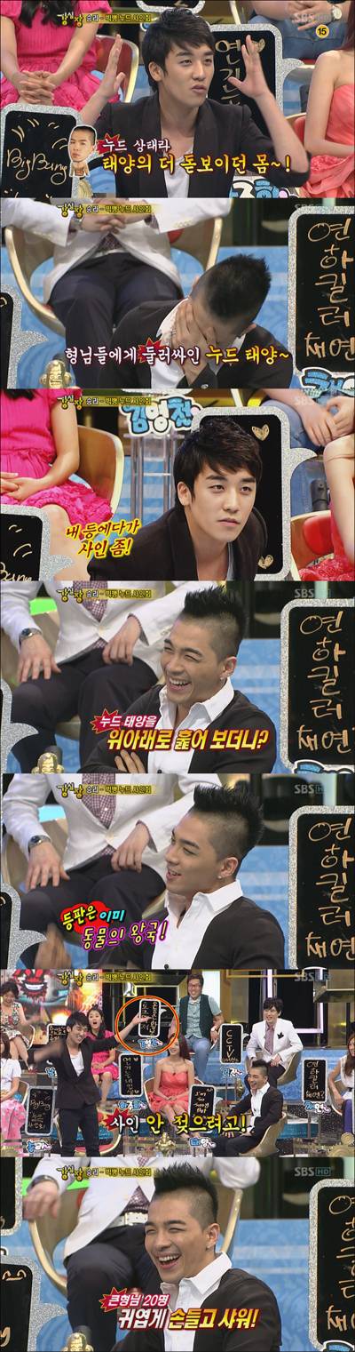 [뉴스엔 이언혁 기자]빅뱅 승리와 태양이 목욕탕에서 누드사인회를 펼쳤던 사연을 고백했다.승리와 태양은 7월 27일 방송된 SBS '강심장'(MC 강호동 이승기)에 출연해 "올누드로 목욕탕에서 사인회를 했다"고 말했다.