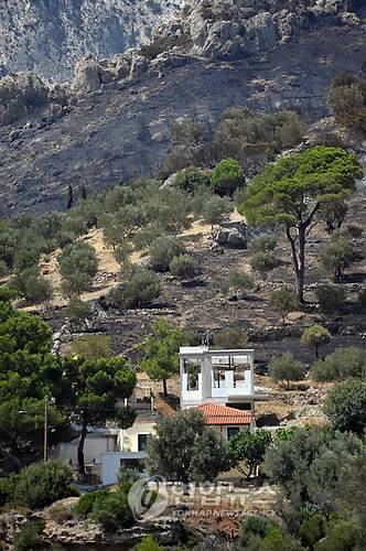 epa02272015 A burnt area is seen very close to the houses in Marathokambos village, Samos Island, eastern Greece, on 03 August 2010, one day after a wildfire broke out in the area. A fire which broke out on Monday at the area of Kakoperato on Samos island is partly under control. According to first estimations the blaze burned 2,500 acres of farm expanse and forestland. The fire came close to residential areas at Votsalakia settlement. The Samos prefect on Tuesday lifted the state of emergency on the island and the tourists returned safely to their holiday resorts. EPA/MICHAEL ANHAEUSER < 뉴스의 새 시대, 연합뉴스 Live >< 모바일 애플리케이션 >< 포토 매거진 >< 저작권자(c)연합뉴스. 무단전재-재배포금지. >