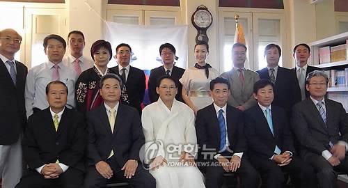 (싱가포르=연합뉴스) 제1회 청소년올림픽을 참관하기 위해 싱가포르를 방문중인 유인촌 문화체육관광부 장관이 15일 싱가포르 한인회관에서 열린 광복절 기념식에 참석, 기념촬영을 하고 있다. 2010.8.15 < < 싱가포르 한인회 > >