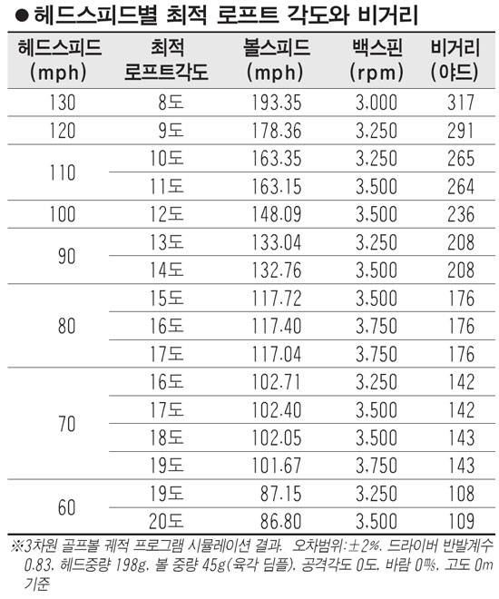 이 같은 딜레마를 극복할 방법은 없을까. 최근 3D 골프 시뮬레이터 '3차원 골프볼 궤적 프로그램'을 개발한 김선웅 고려대 반도체물리학과 명예교수는 자신의 헤드 스피드에 맞는 드라이버 헤드의 로프트 각도만 알아도 비거리를 상당히 향상시킬 수 있다고 설명한다.