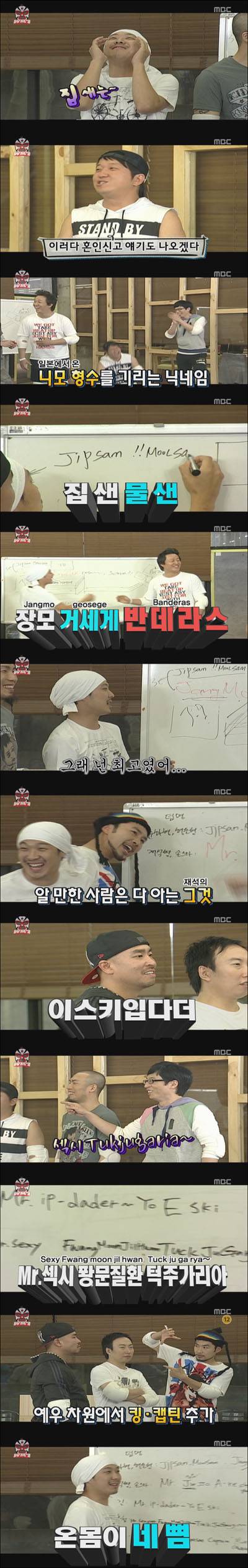 박명수의 별명은 '원머리 투냄새 캡틴 곰팡이'였다. 한 머리에서 두 가지 냄새가 난다는 박명수. 그의 캐릭터를 잘 살린 모습이다. 노홍철은 '섹시 맵시 퐝문질환 턱주가리아'. 평소 항문 질환을 갖고 있던 것으로 알려진 노홍철. 그리고 그의 유명한 하관. 이를 닉네임으로 승화시킨 것이다.