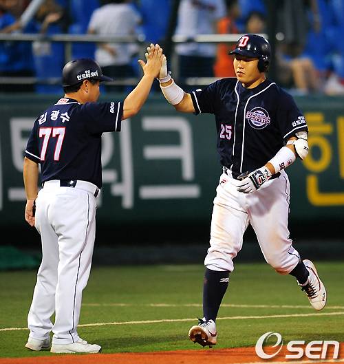 [OSEN=대전,지형준 기자] 29일 대전구장에서 열린 '2010 CJ마구마구 프로야구' 한화 이글스와 두산 베어스의 경기, 7회초 무사에서 두산 양의지가 역전 솔로포를 날리고 김광수 코치와 하이파이브를 하고 있다. 이번 홈런으로 양의지는 신인왕 자격 포수 한 시즌 최다홈런 신기록. /jpnews@osen.co.kr